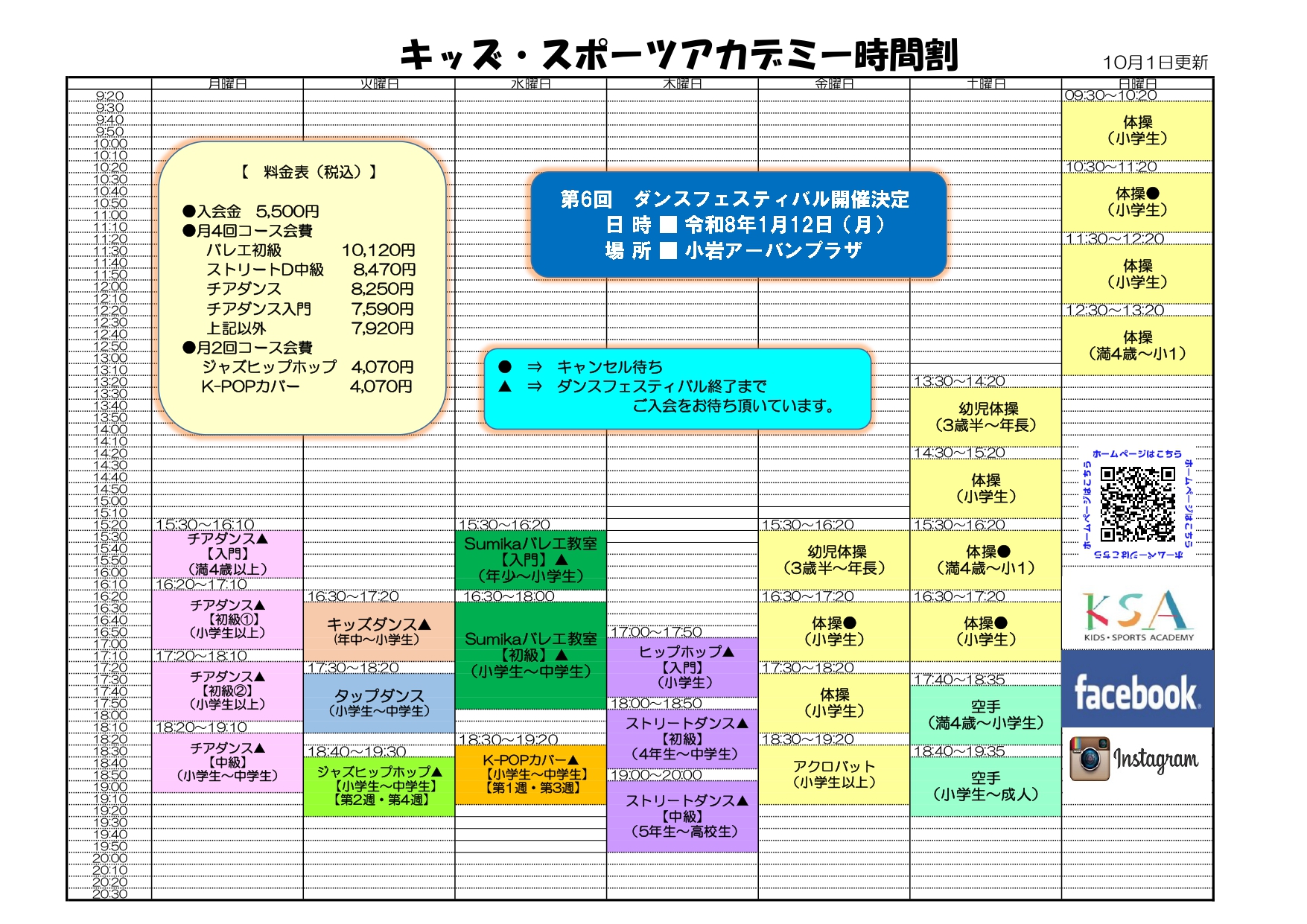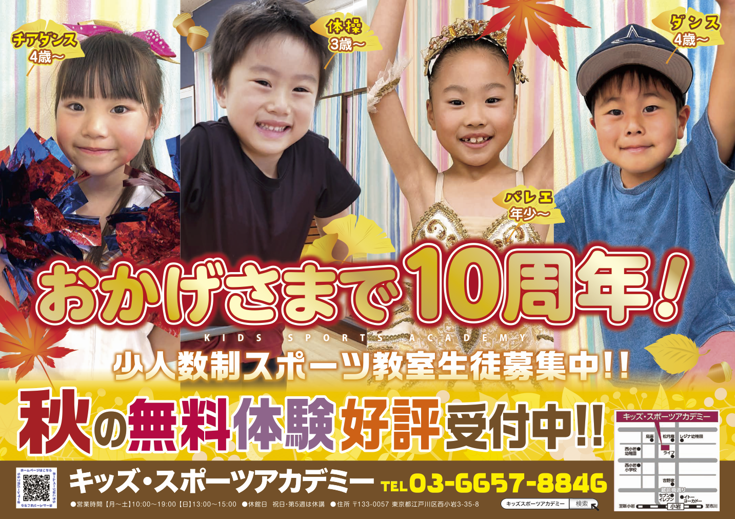 体操、チアダンス、ストリートダンス、ヒップホップ、バレエ、タップダンス、K-POP、空手など多種に渡り、3歳半から高校生が、経験豊富な先生の指導のもと楽しく体を動かしています。